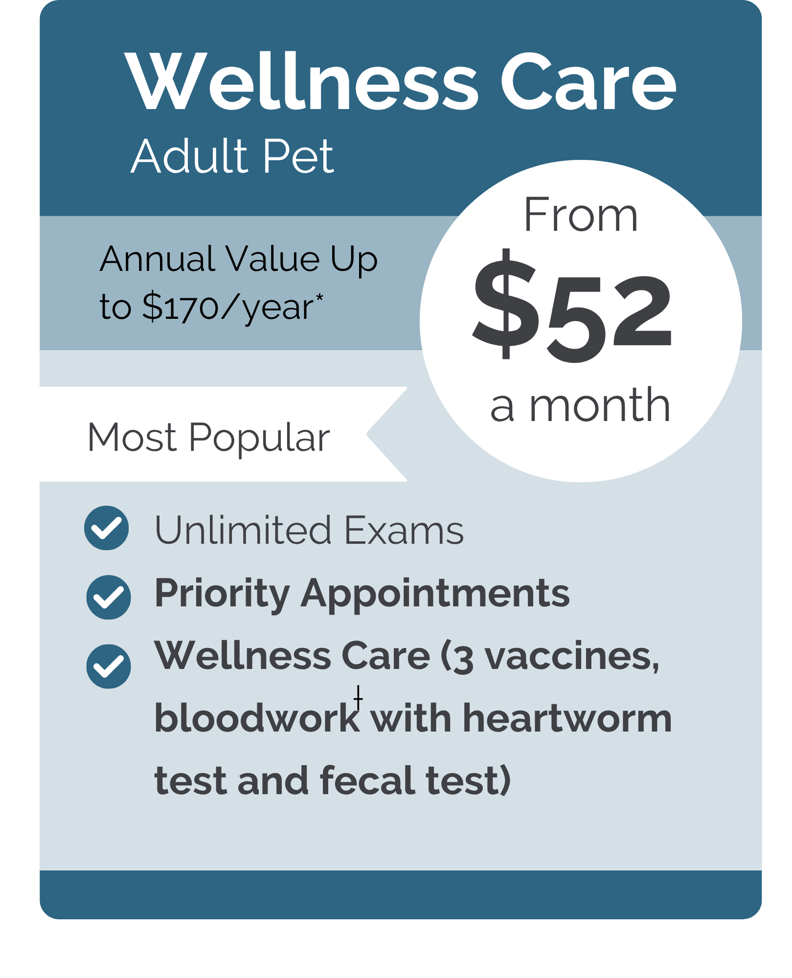 Whether it’s priority appointments and unlimited wellness exams, or you want the full vaccinations and core diagnostics, you’re covered—allowing you to budget for your pet’s care with ease.